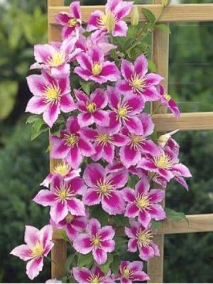 Clematită roz/alb- Clematis ‘Piilu’ face parte din categoria plantelor cățărătoare (liane) și este decorativă datorită florilor sale de culoare roz cu alb. Înflorește abundent în lunile iunie-septembrie.Se pretează la soare, semi-umbră și umbră. Rezistă la temperaturi de -28 grade Celsius. În decurs de aproximativ 3 ani poate atinge o înălțime de 2m.