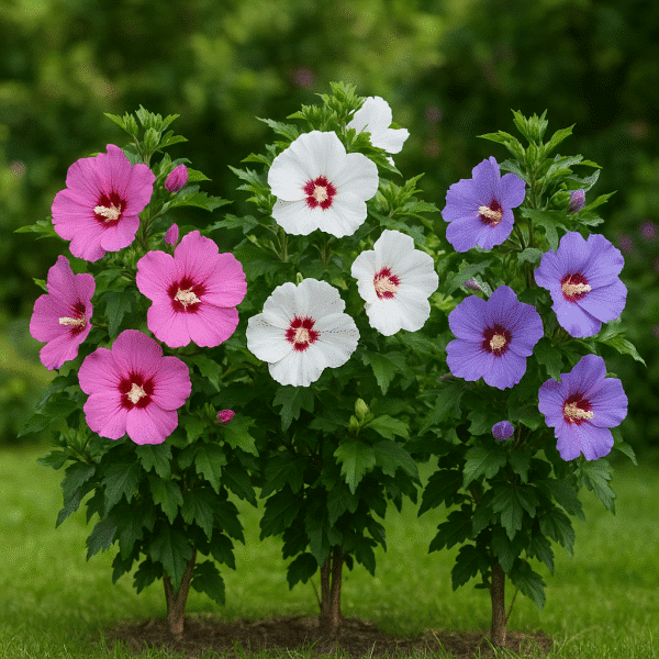 Pachet special cu 3 hibiscusi de grădină (Hibiscus syriacus) – roz, alb și mov. Arbust ornamental rezistent, cu flori mari, spectaculoase, care înfrumusețează grădina din iulie până în septembrie.
