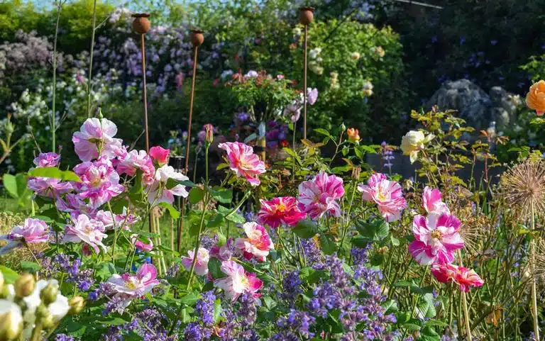 Fuchsia distinctivă, cu dungi, și petalele albe creează un aspect îndrăzneț, dar natural, care amintește de vechii trandafiri Gallica. Florile sale semi-duble apar din abundență, atrăgând polenizatorii către staminele centrale, galbene vibrante. Parfumul ușor-mediu de mosc șoptește note de măr roșu proaspăt și apă de trandafiri. Un arbust versatil și robust, cu o creștere în formă de vază și frunze în formă de inimă.